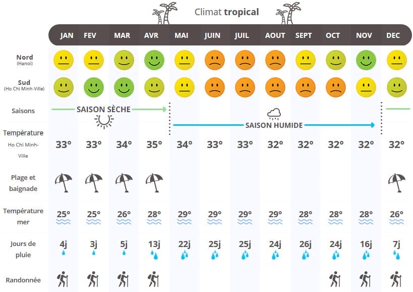 Notons que le Vietnam est caractérisé par un climat de type tropical au sud et subtropical au nord avec les moussons et un taux d’humidité particulièrement élevé. Néanmoins, le climat change d’une région à autre et selon les mois précis. À remarquer comme suivant :