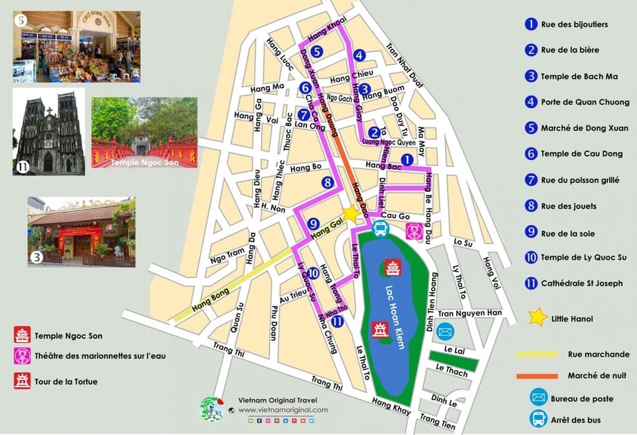 Chả Cá : rue des poissons grillées, Hàng Bạc : rue de l’argent, Hàng chiếu : rue des nattes, Hàng Đồng : rue du cuivre, Hàng Mã : rue de votif, Lãn Ông : rue des plantes médicinales, Lò Rèn : rue des forgerons… |