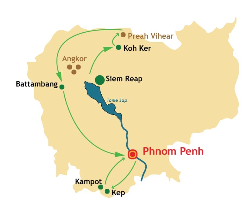 Temples d’Angkor – Tonle Sap – Koh Ker - Preah Vihear – Battambang – Phnom Penh – Kep – Kampot